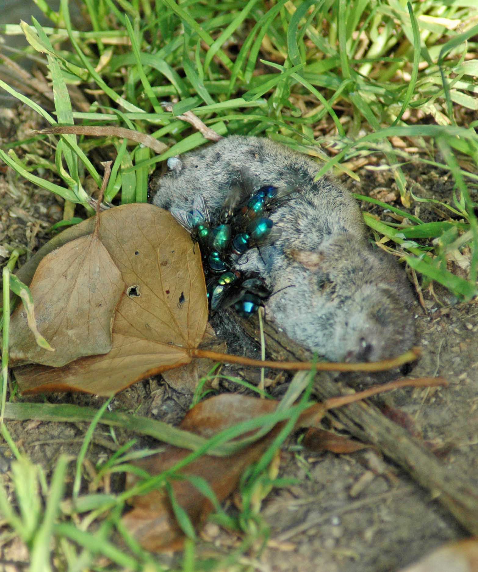 Greenbottle flies were most numerous on the corpse, but there are two other species there too