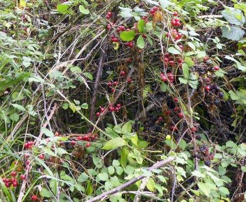 We headed out of the woods and back onto safer ground to resume our berry hunt. Many were tantalising beyond our reach, like these that hung high above a twining rope of heavily-berried Black Bryony.